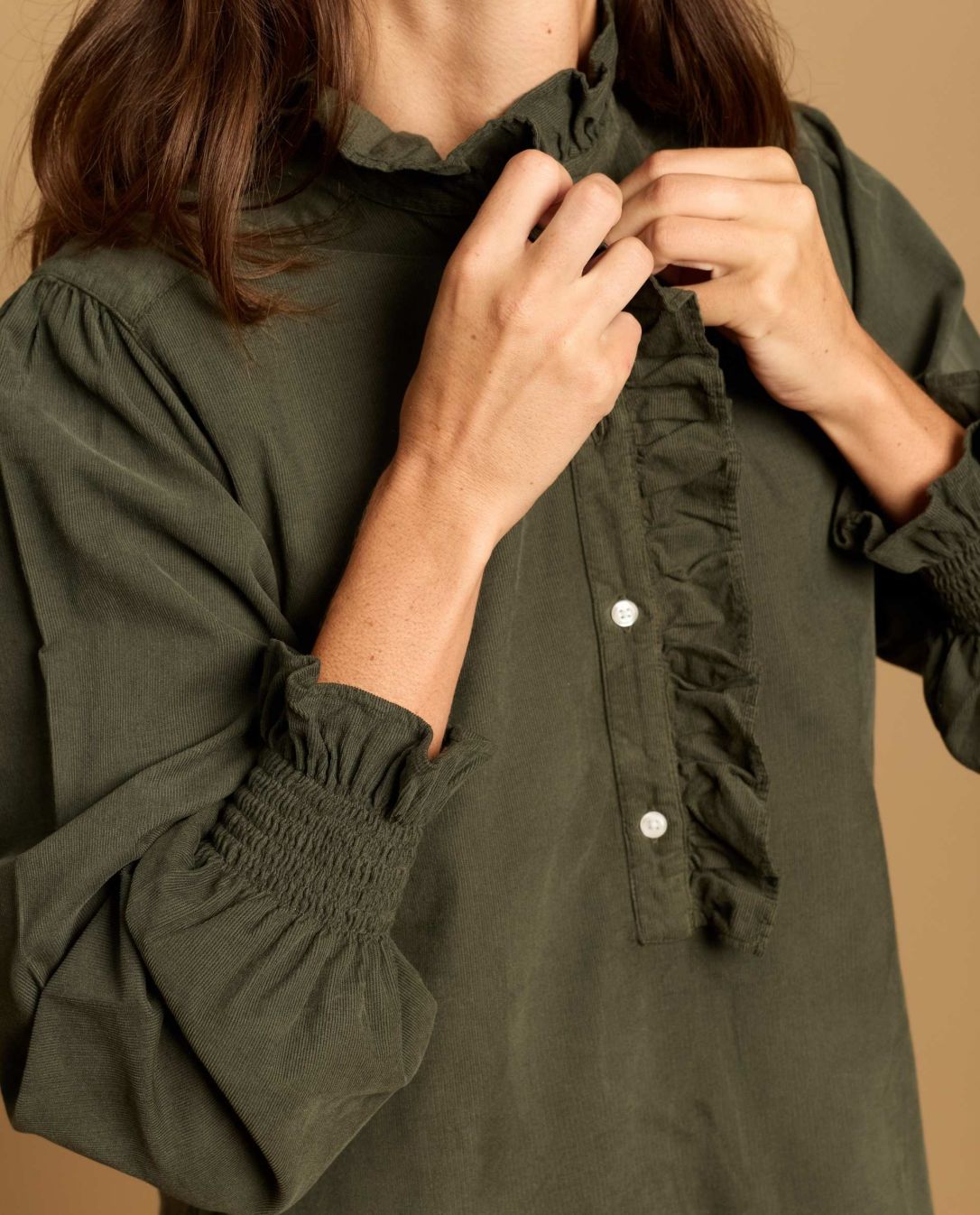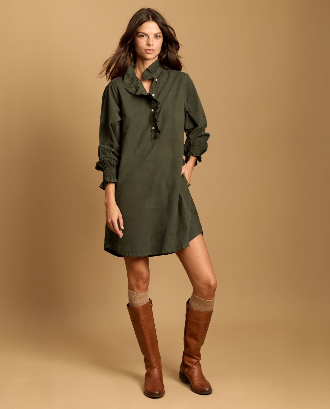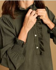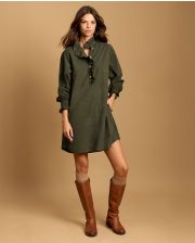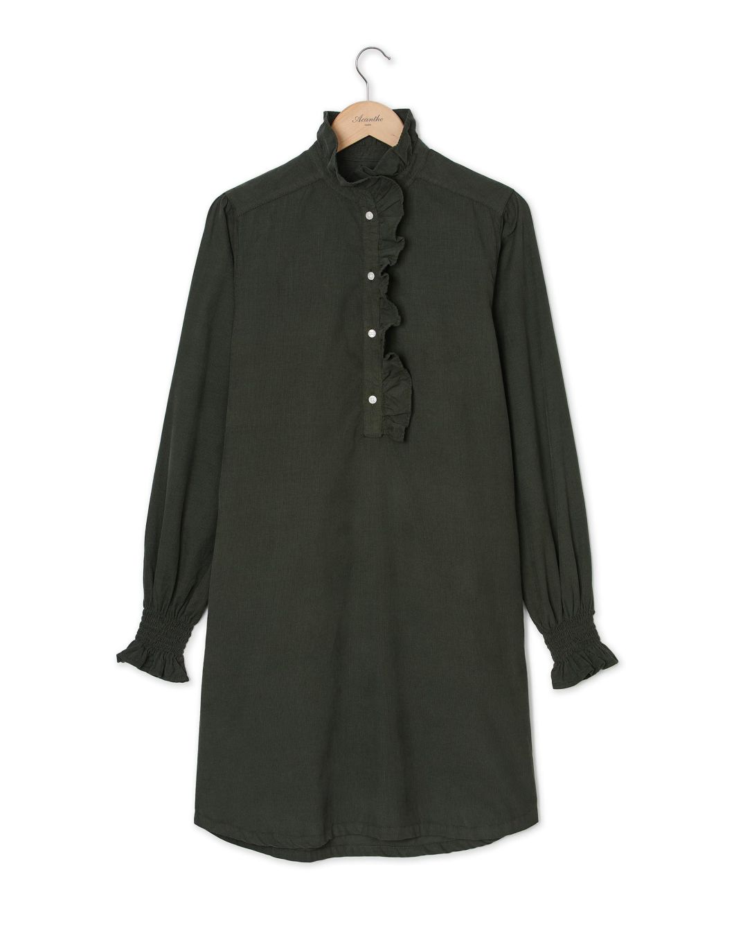 Robe évasée en velours, avec petit volant au col et demi patte de boutonnage.Manches longues smockées avec volant. Longueur épaule 95 cm en taille 1. Le mannequin mesure 1,80m et porte une taille 1.
