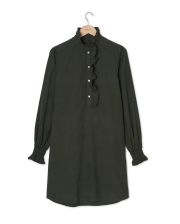 Robe évasée en velours, avec petit volant au col et demi patte de boutonnage.Manches longues smockées avec volant.