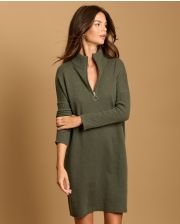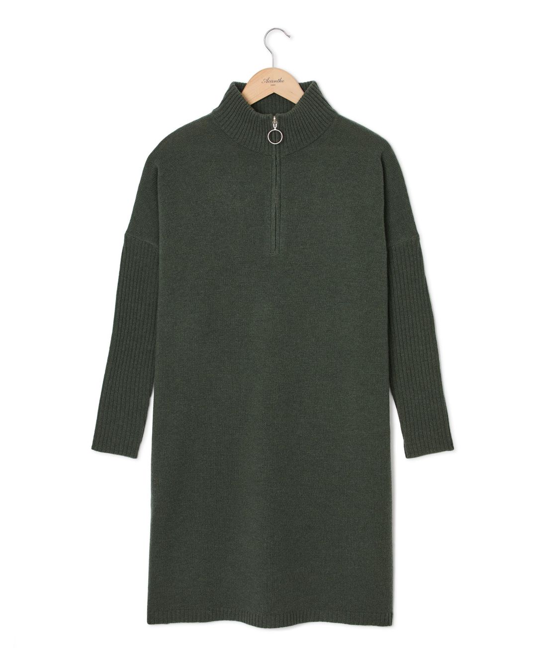 Robe col zippé. Manches longues ajustées en côtes. Pure laine d'agneau. Taille unique. Longueur épaule 90 cm. Le mannequin mesure 1,80m.