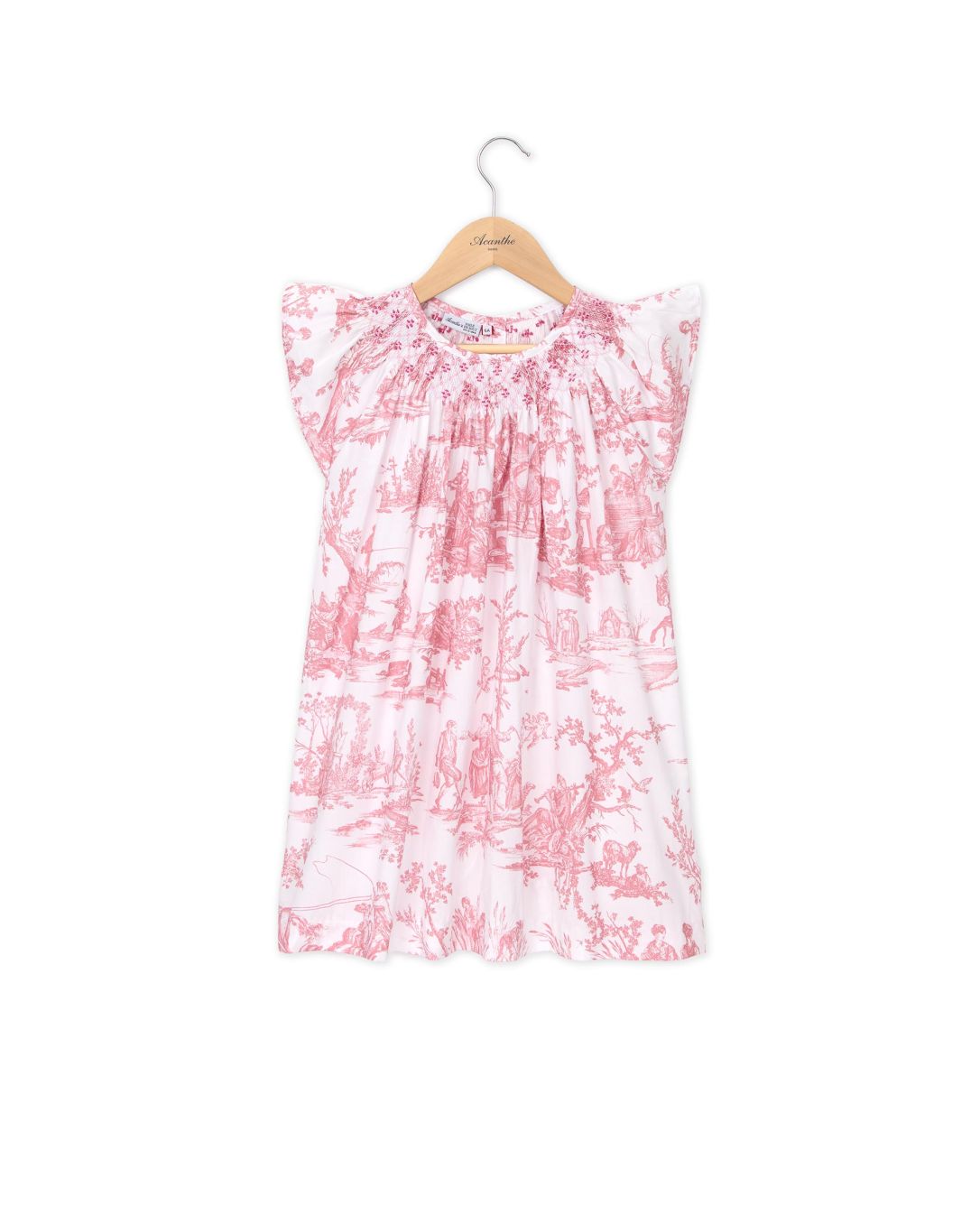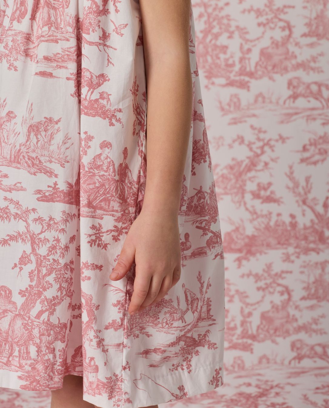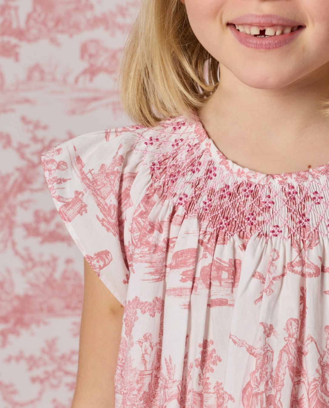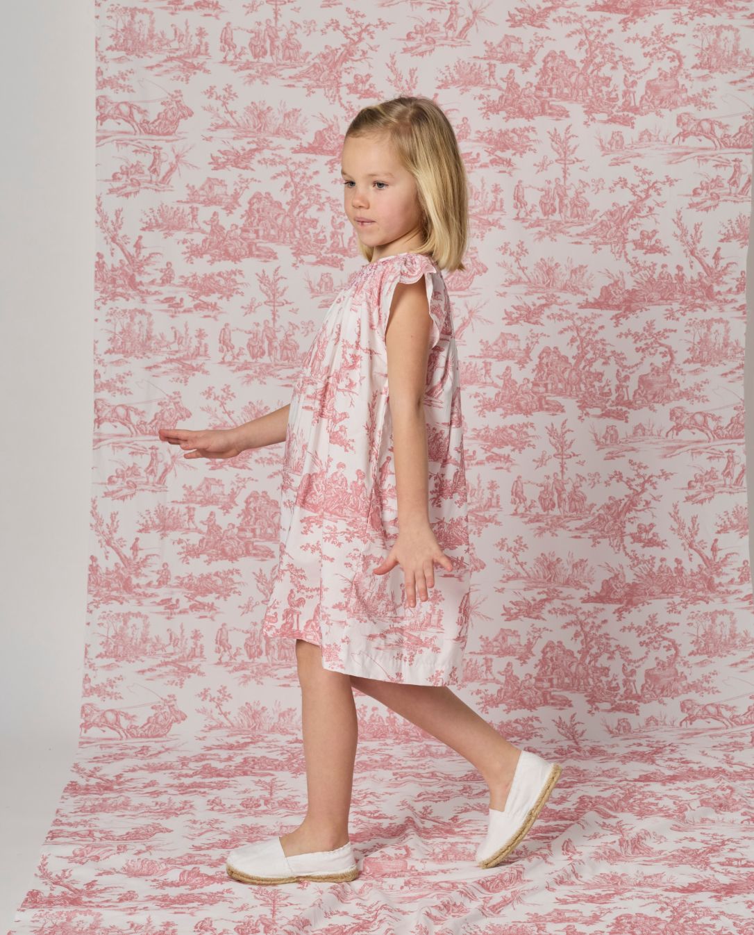 Robe volant épaule. Encolure ronde smockée. Emmanchure raglan. Boutonnage dos. Popeline coton.