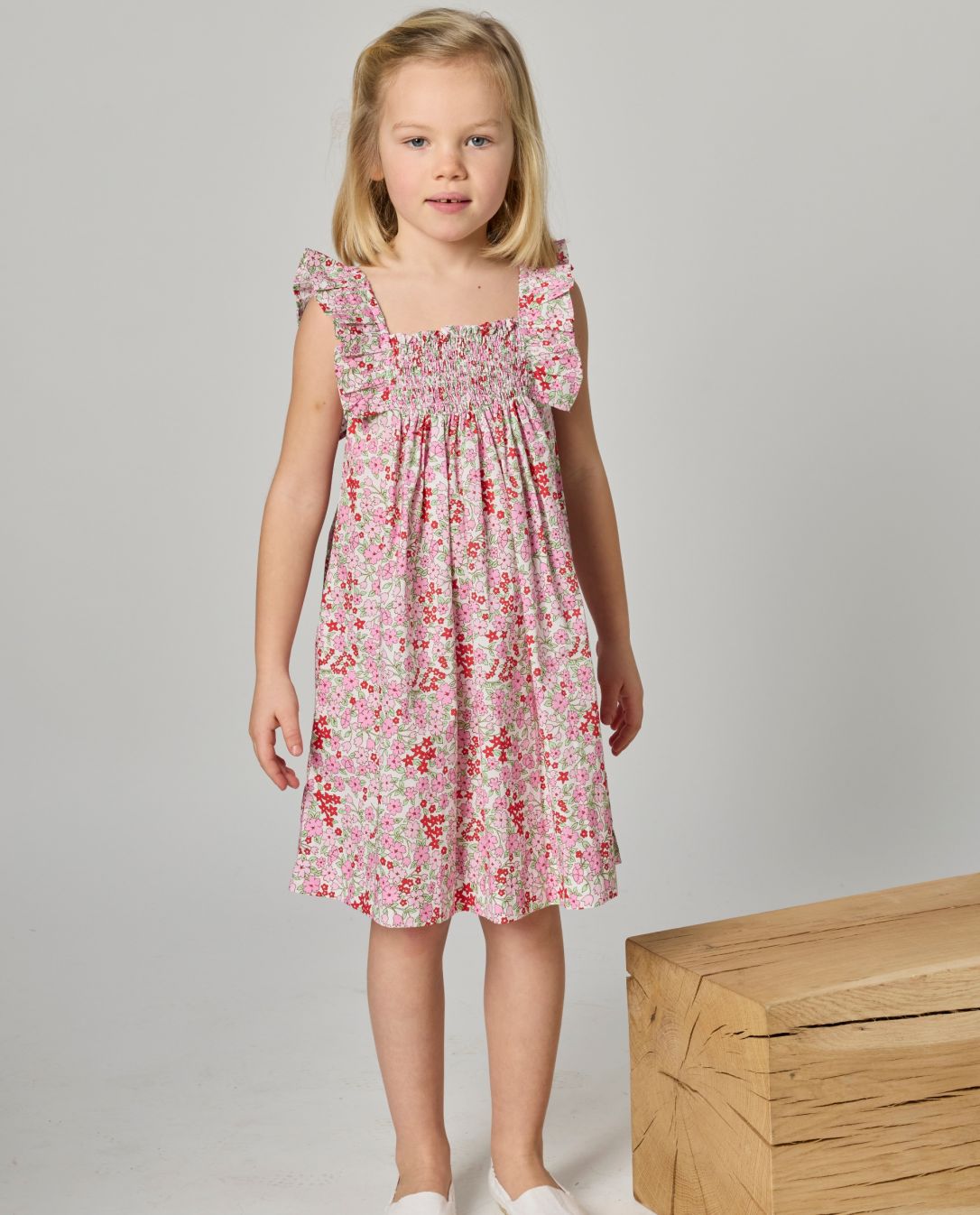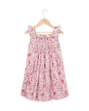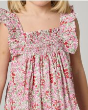 Robe smockée à volants. Empiècement smocké au devant et au dos. Larges volants sur les épaules.