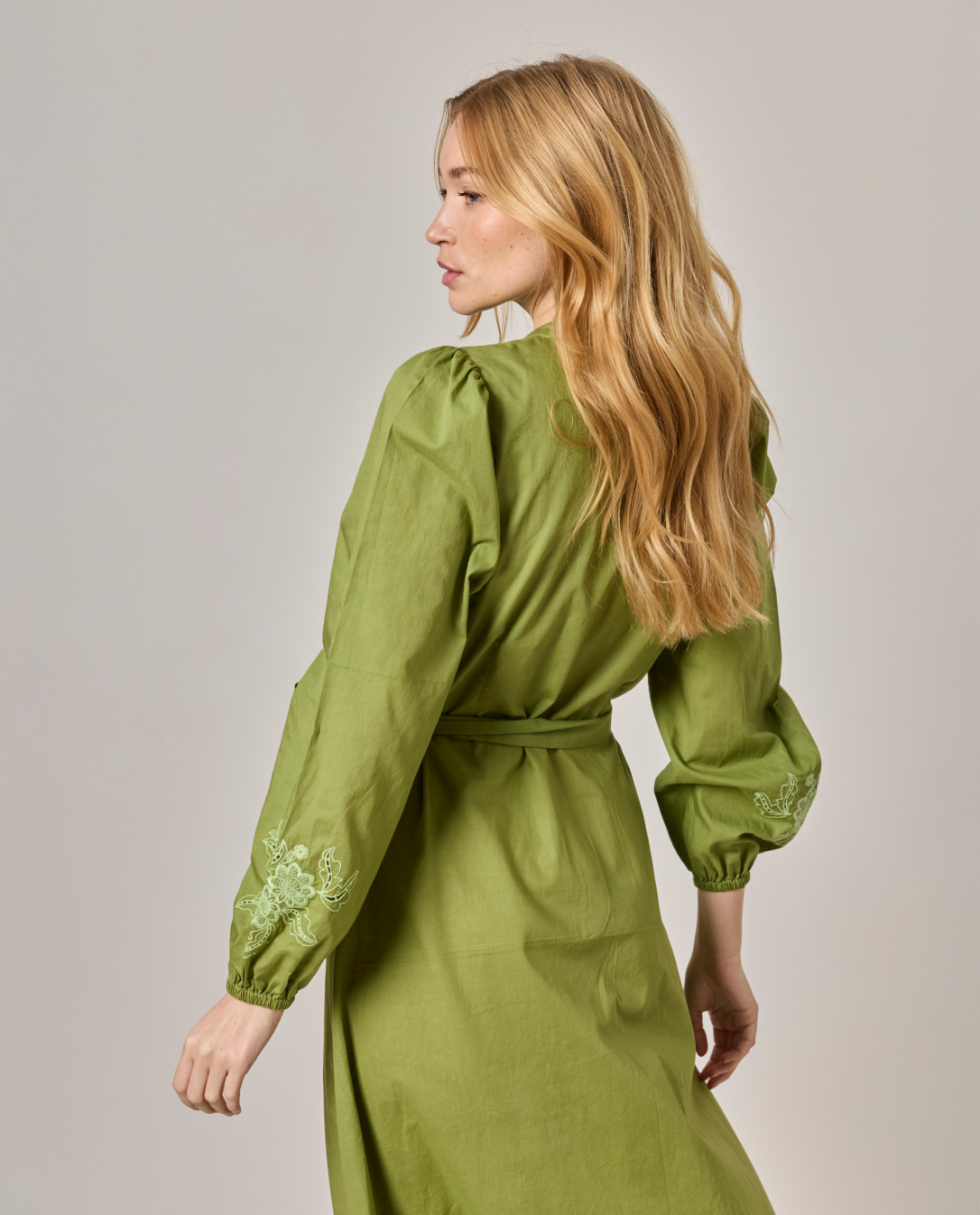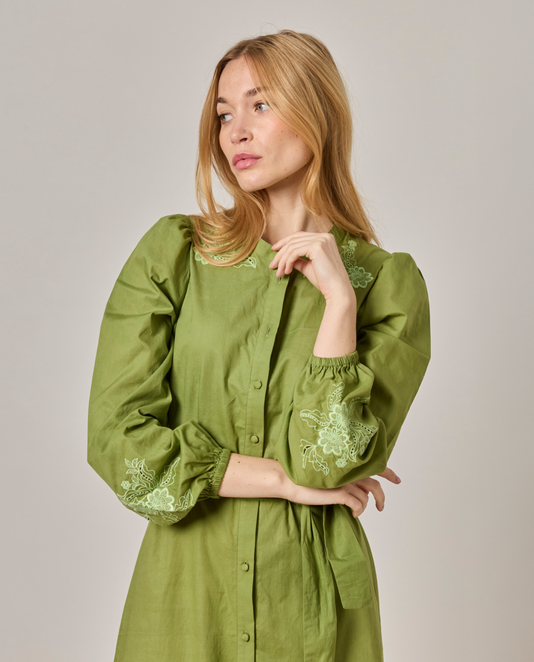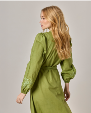 Robe longue brodée encolure ronde. Popeline coton uni. Manches longues bouffantes. Longueur 131 cm en taille 1. Entièrement boutonnée devant. Ceinture amovible. Le mannequin mesure 1,73m et porte une taille 1.