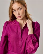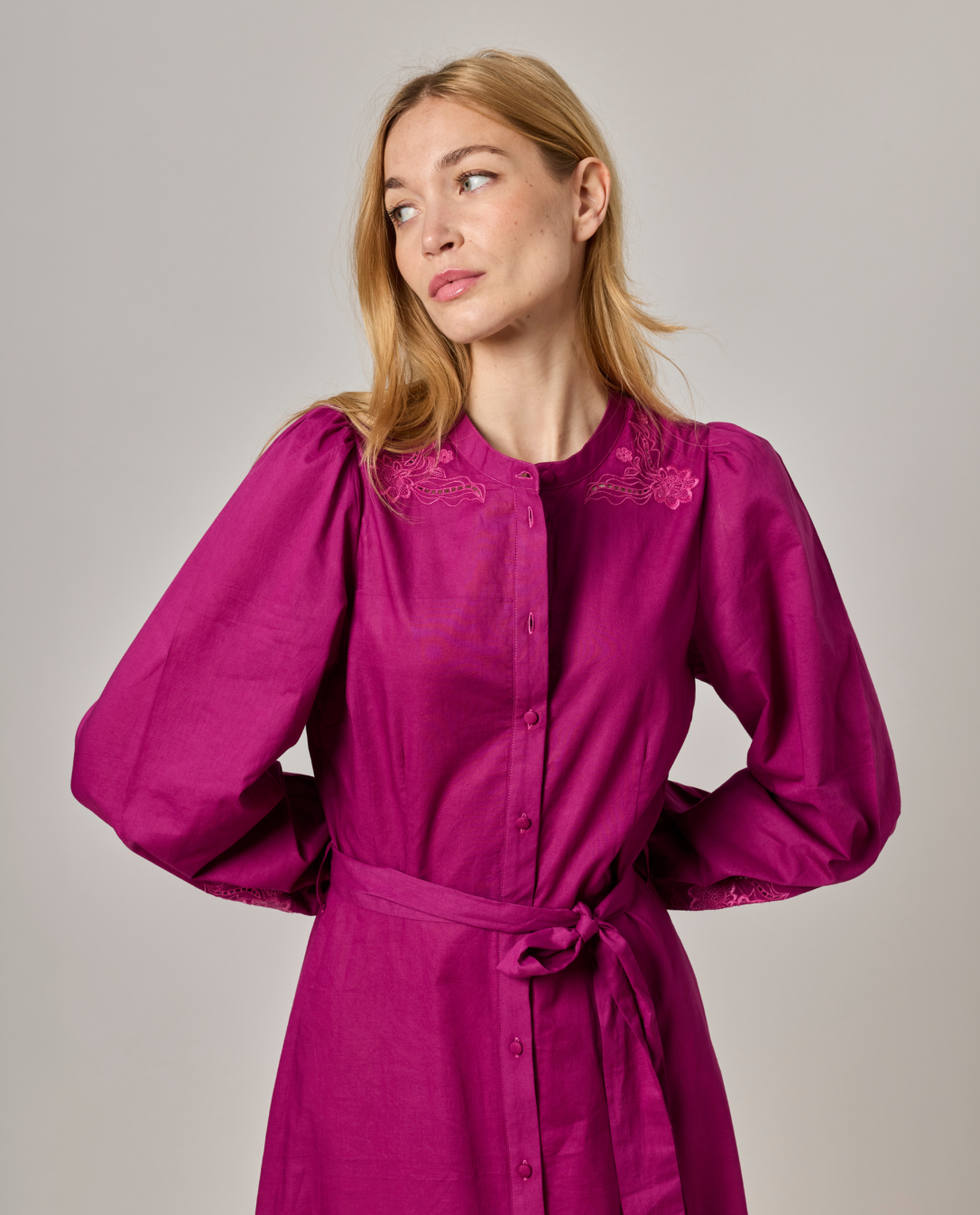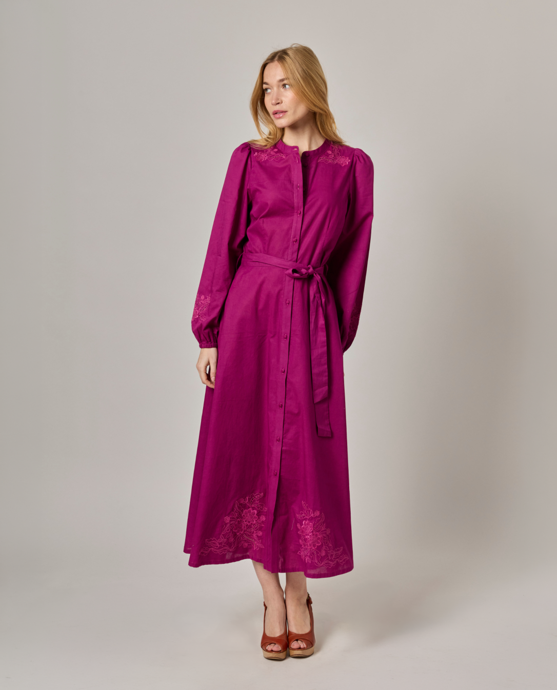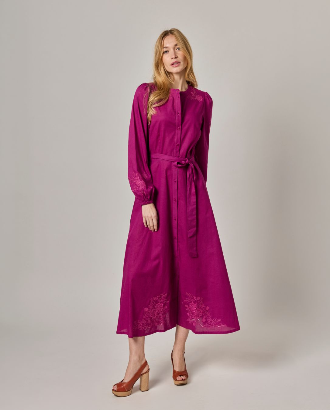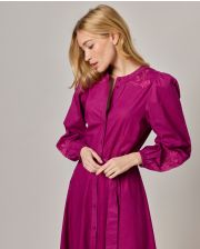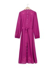 Robe longue brodée encolure ronde. Popeline coton uni. Manches longues bouffantes. Longueur 131 cm en taille 1. Entièrement boutonnée devant. Ceinture amovible. Le mannequin mesure 1,73m et porte une taille 1.