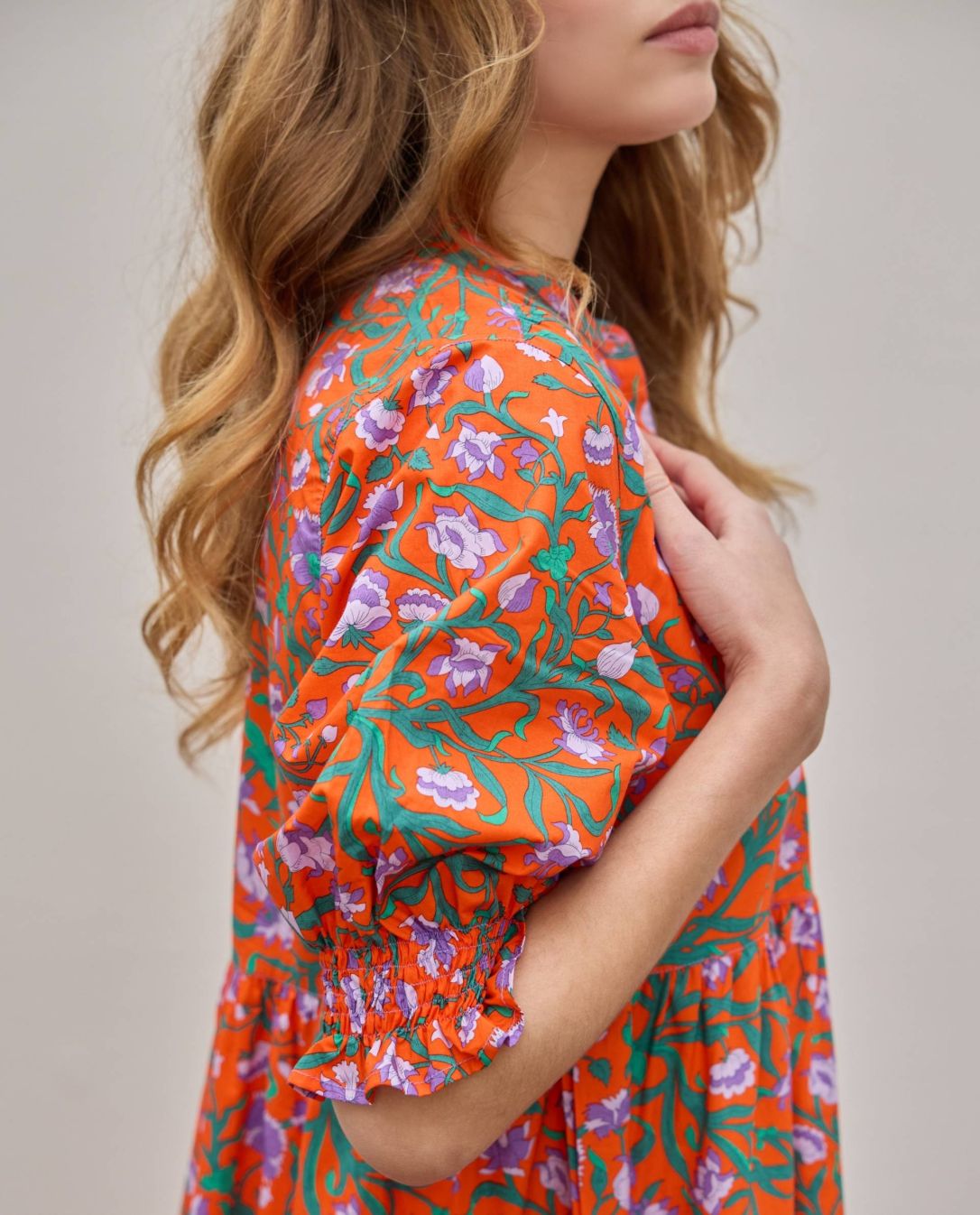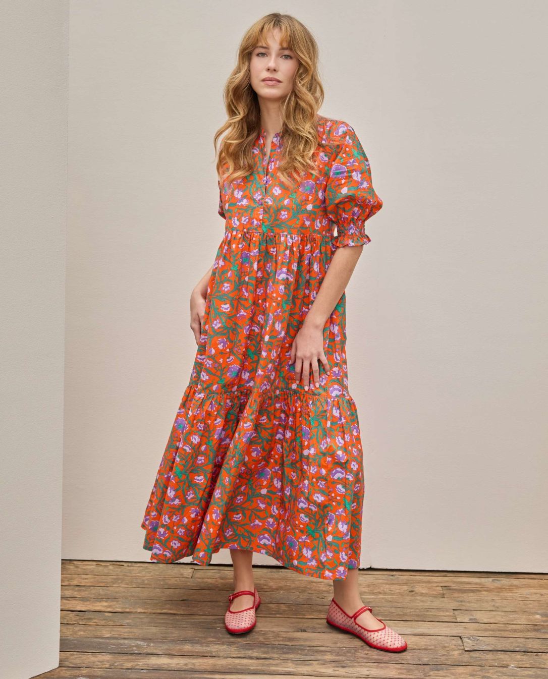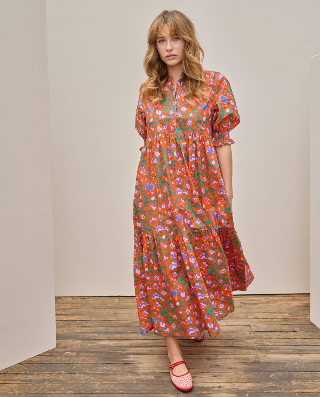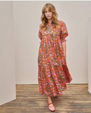 Robe longue encolure ronde avec manches courtes légèrement bouffantes et se terminant par des smocks. Tissu Liberty popeline lourde Picadilly.100% coton. Longueur depuis l'épaule pour une taille 1 : 135 cm.Le mannequin mesure 1m73 et porte du T1.