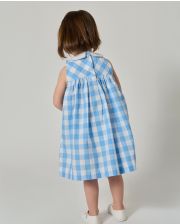 Robe emmanchure américaine. Col carré en popeline blanche. Bas froncé à partir de la taille haute. Boutonnage dos. Buste doublé en coton. Popeline coton.