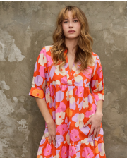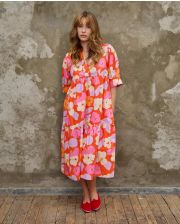 Robe mi-longue encolure ronde ouverte en V. Manches courtes finition bracelet. Tissu Liberty popeline lourde Picadilly.100% coton. Longueur depuis l'épaule pour une taille 1 : 120 cm.Le mannequin mesure 1m73 et porte du T1.