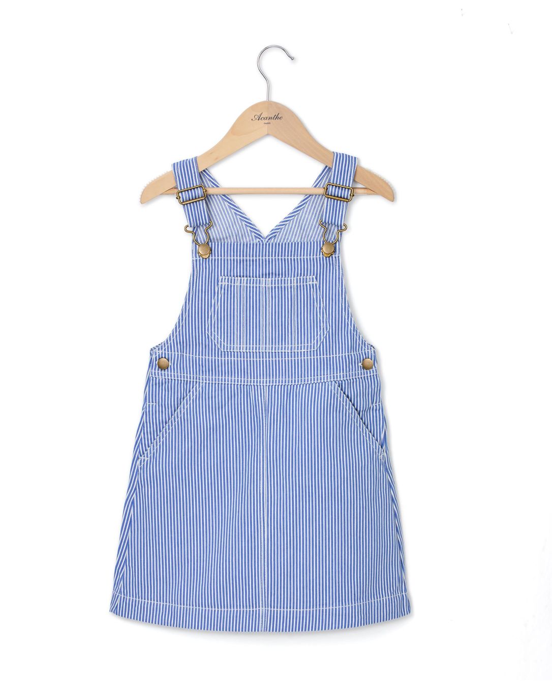 Robe salopette twill rayé. Accroches bretelles et boutons en métal en haut de la bavette. Poche plaquée sur la bavette. Deux poches italiennes sous la taille.
