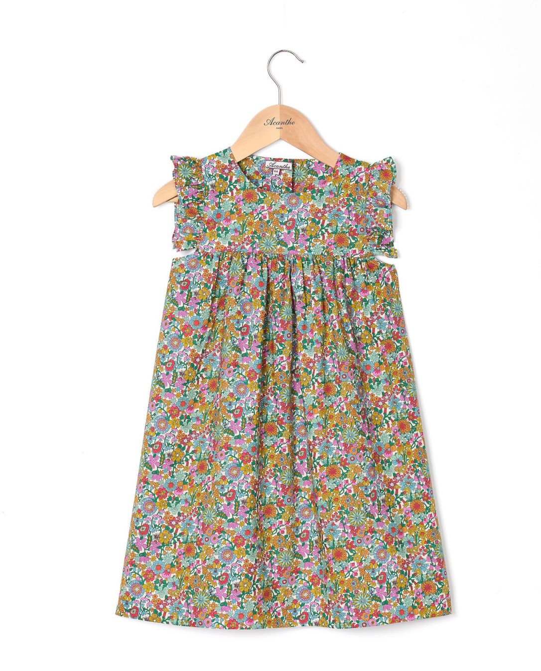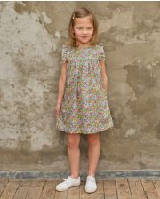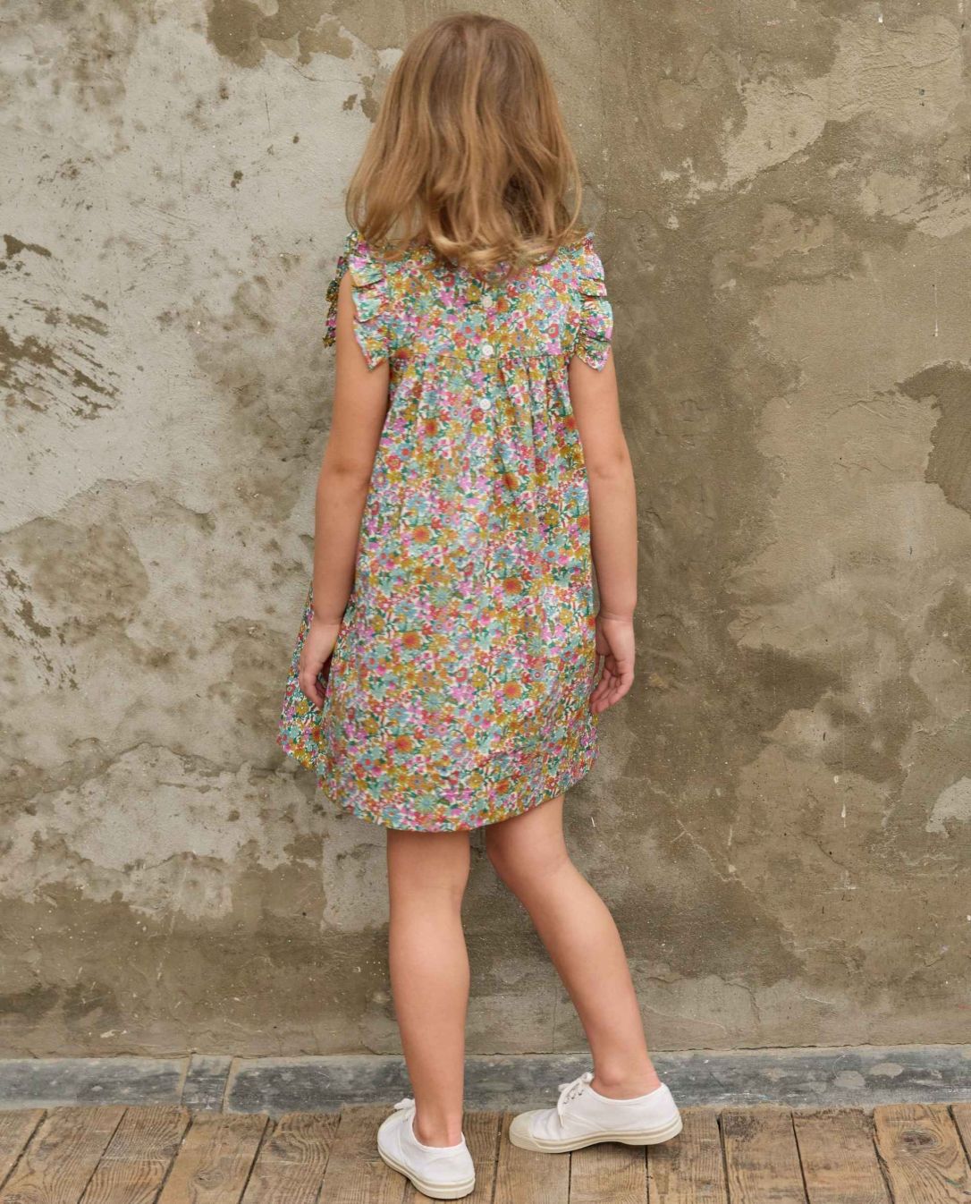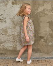 Encolure ronde devant et dos. Volant à l'épaule au niveau du buste. Boutonnage dos. Tissu Liberty. 100% coton.