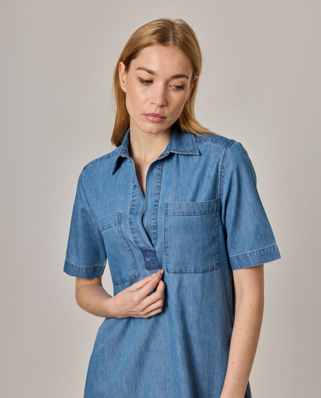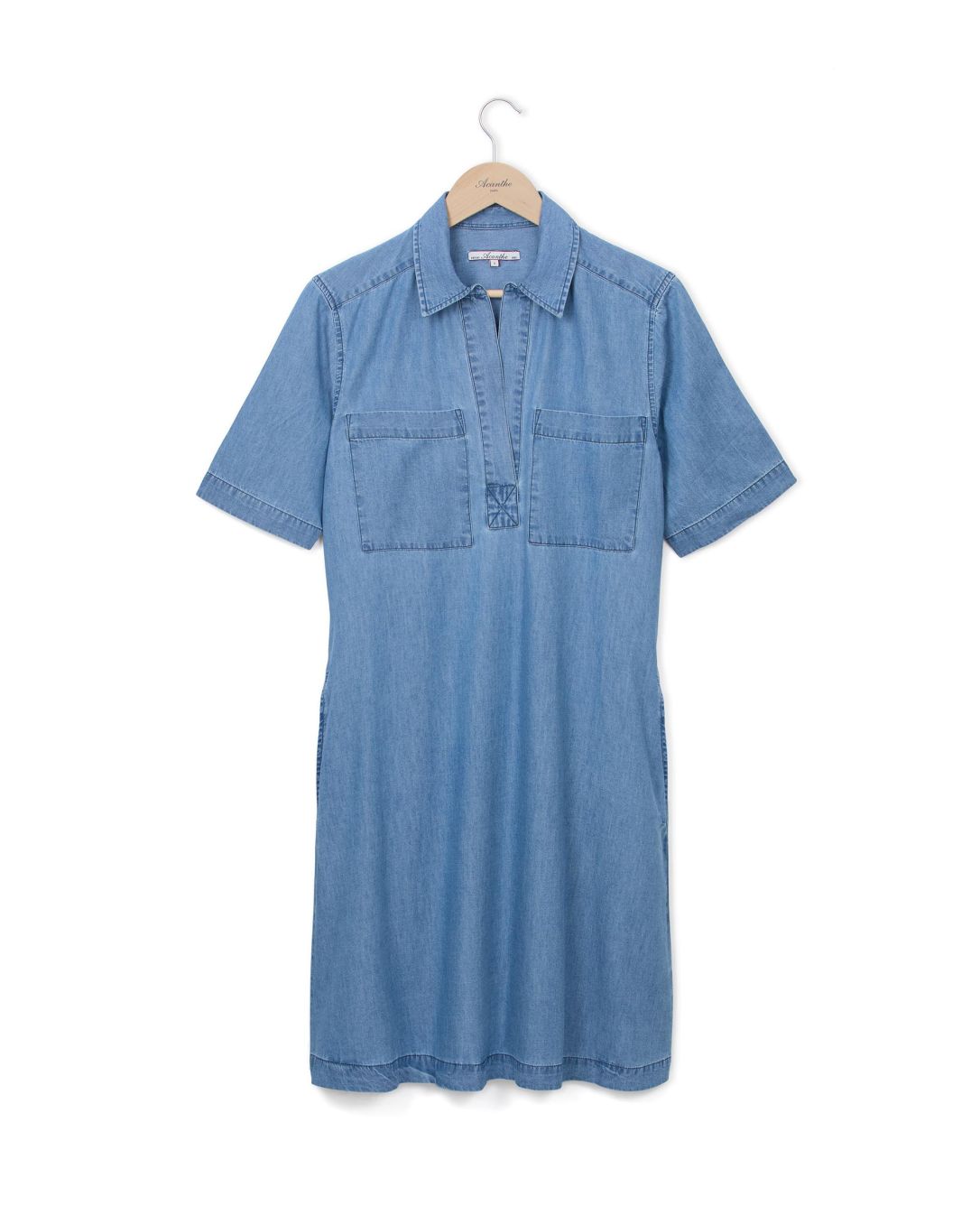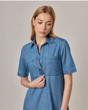 Robe col polo ouvert. Patte de boutonnage ouverte sans bouton. Manches courtes au coude. Deux poches intérieures sur les côtés et deux poches poitrine. Denim coton. Longueur totale 96 cm en taille 1. Le mannequin mesure 1,73m et porte une taille 1.