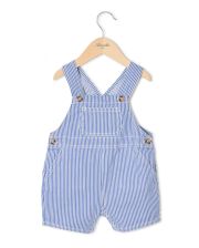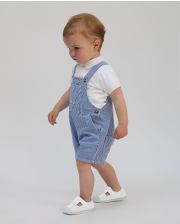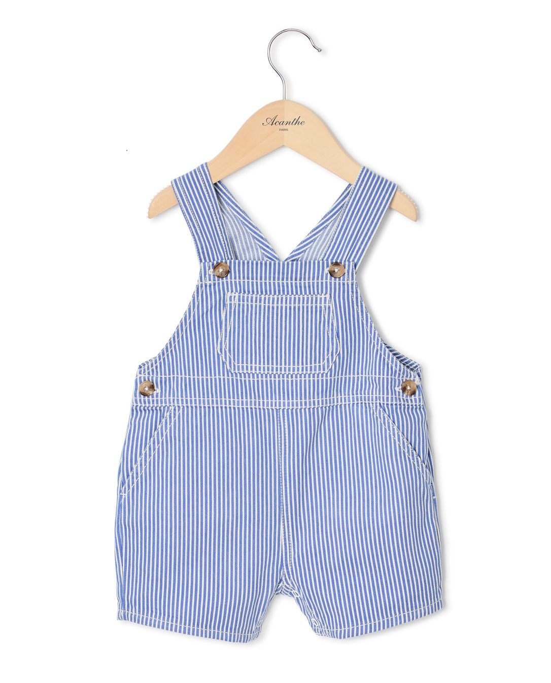 Bretelles boutonnées. Ouvertures côtés. Poche arrondie sur la bavette et poches plaquées dos. 100% coton.