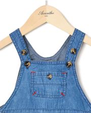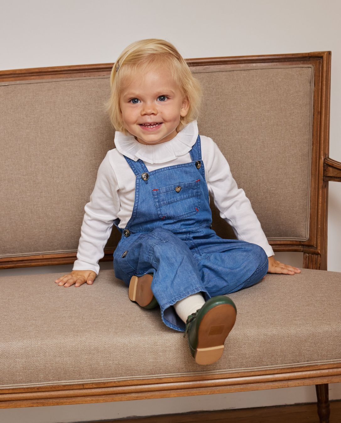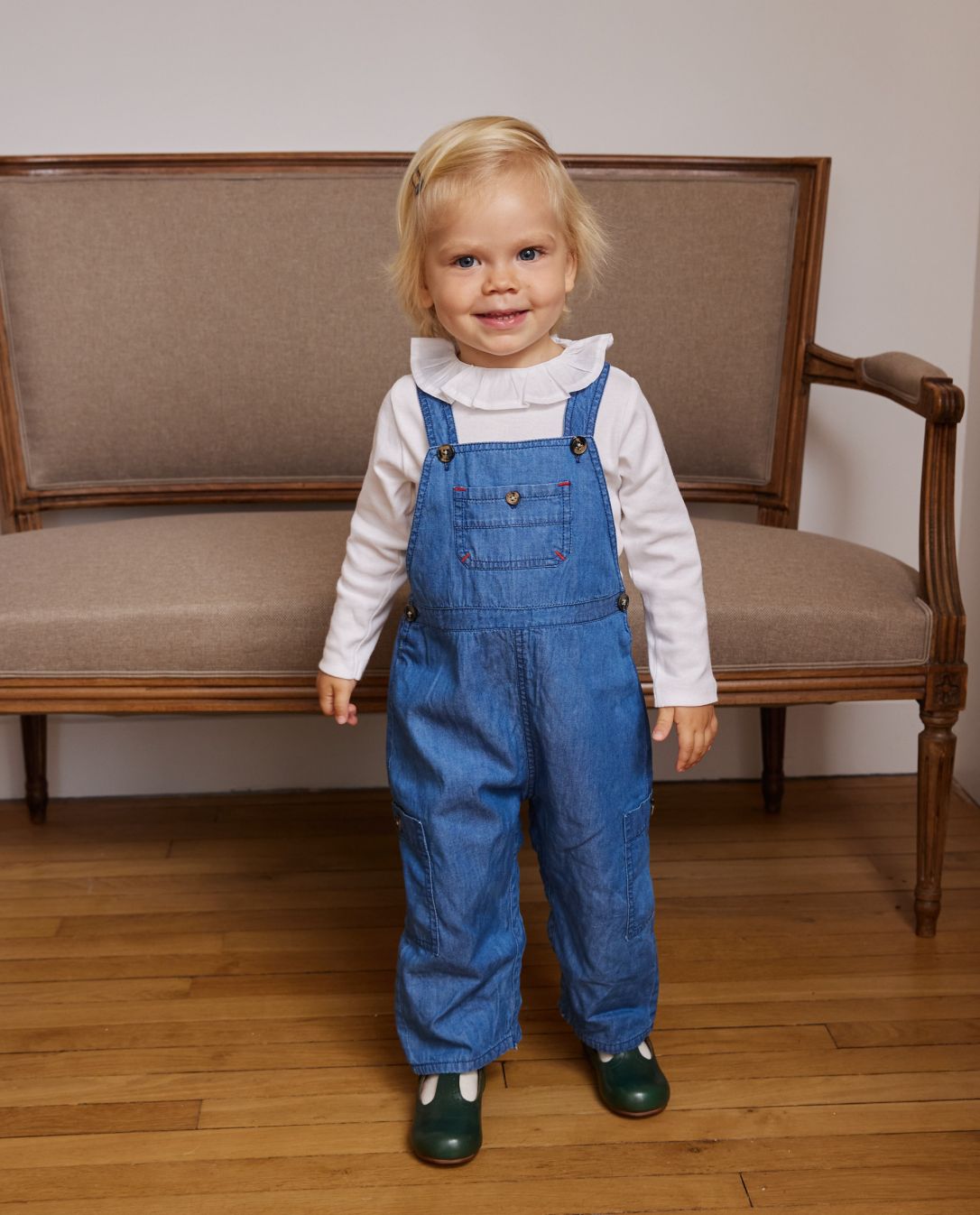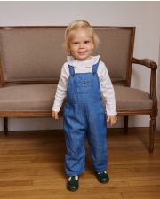 Salopette longue en denim. Bretelles boutonnées. Ouvertures côtés et pressions à l'entrejambe. Poche sur la bavette. Doublure en toile de coton. 100% coton.