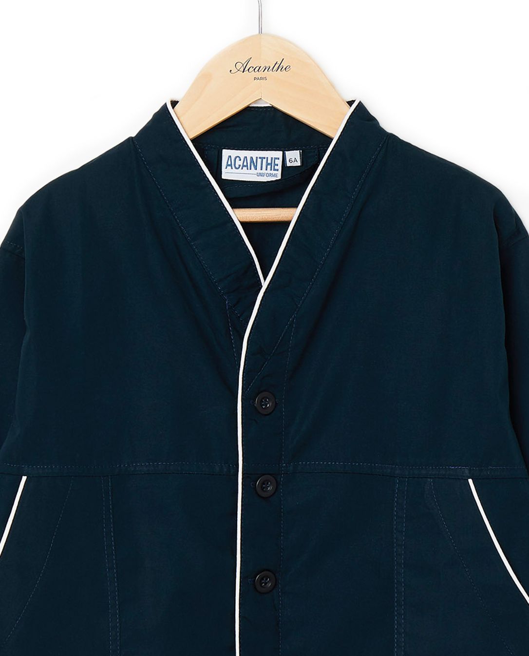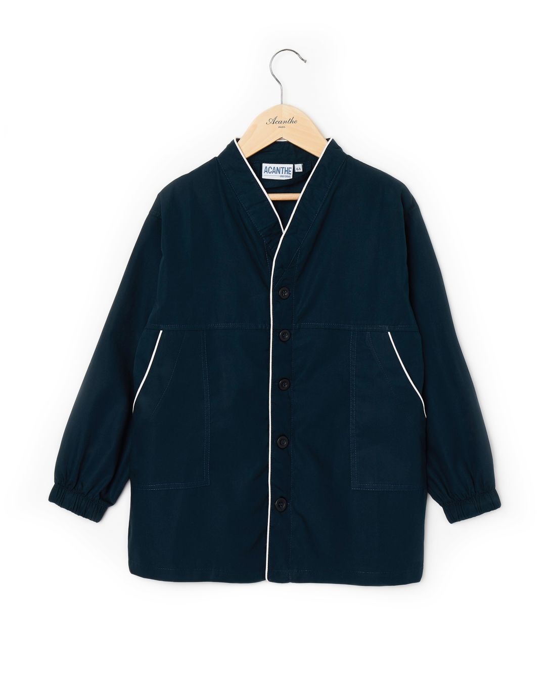 Tablier garcon encolure V, boutonne devant, poignets elastiques et poches plaquees. Finition passepoil.