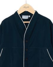 Tablier garcon encolure V, boutonne devant, poignets elastiques et poches plaquees. Finition passepoil.