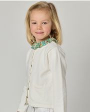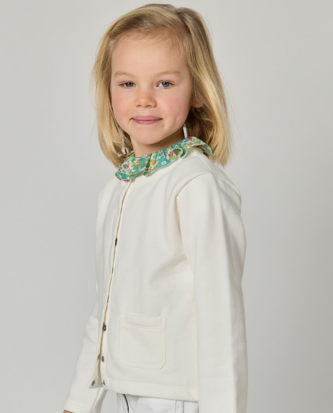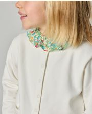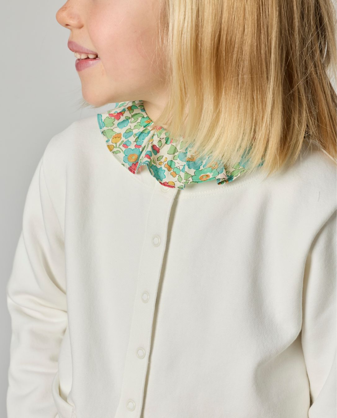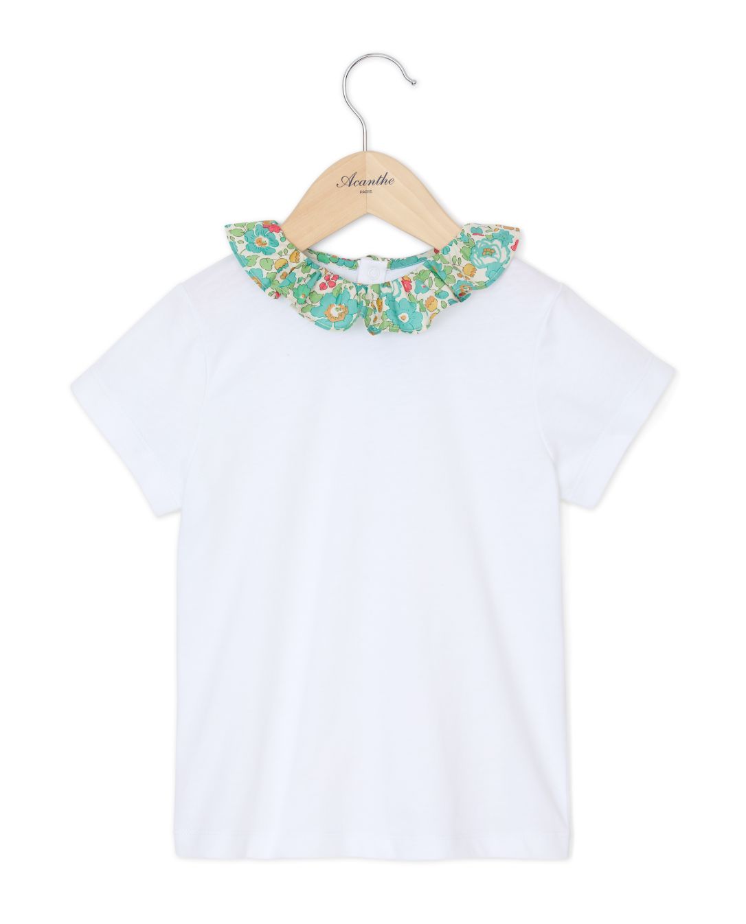 Tee shirt col volanté. Maille jersey. Manches courtes. Col volanté en tissu Liberty Betsy D. Boutons pression au dos.