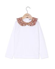 T-shirt col rond orné d'un petit volant en tissu Liberty. Manches longues. Boutonné au dos. Maille jersey coton. 100% coton.