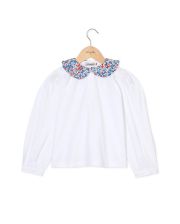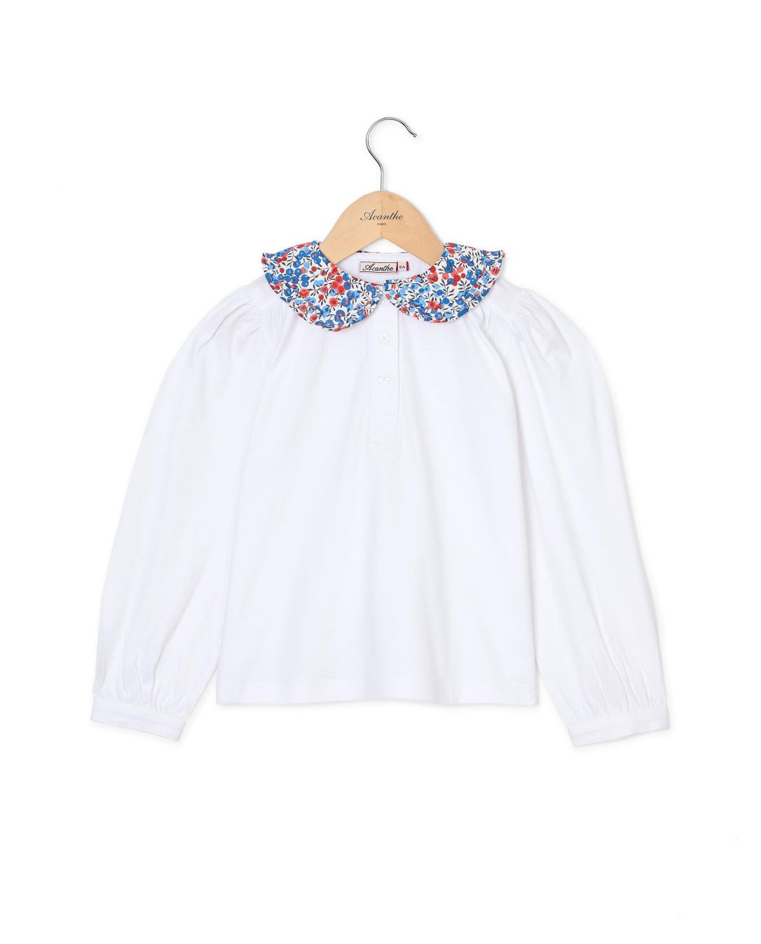 T-shirt col rond orné d'un petit volant en tissu Liberty. Manches longues. Boutonné au dos. Maille jersey coton.