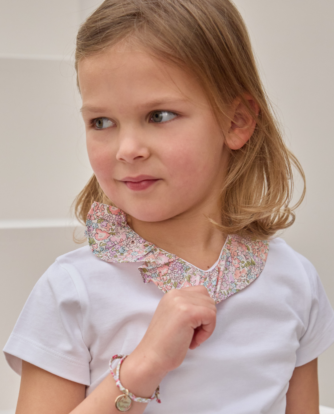 T-shirt en maille jersey avec col volanté en tissu Liberty. Boutonné au dos. 100% coton.