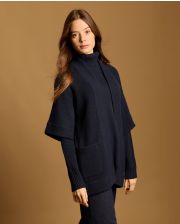 Veste ample kimono en cachemire double fil. Manches courtes, larges et tombantes. Finition bord côtes double. Taille unique. Longueur épaule 70 cm. Le mannequin mesure 1,72m.